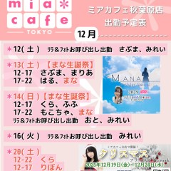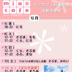 🎍#年賀状📮https://t.co/CjIVfjbH2f ★#メイドカフェ ・ミアカフェ #秋葉原 店★ ☕️営業予定日☕️ 🎀12月12日(金)  リラ&フォトお呼び出し出勤 さぶま、みれい 🎀12月13日(土)  12-17 さぶま,まりあ  17-22 🎂まな,はる 🎀12月14日(日)  12-17 くら,ふふ  17-22 🎂まな,もこちゃ #生誕祭 https://t.co/lyQuFXVzNt