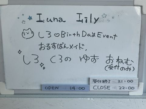 本日8月24日(土)は「納涼イベント」です。 お留守番メイドは、 14時~ くろの、ゆず 17時~ みづき です。 皆様のお帰りをお待ちしております。 #ルナリリー #メイドリフレ #メイド #大阪日本橋 https://t.co/gtoJf5Gb7M