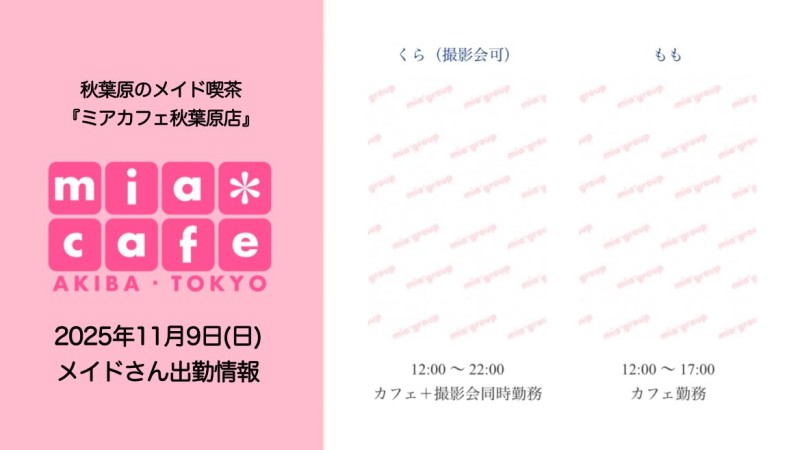 ★メイドカフェ・ミアカフェ #秋葉原 店★ ☕️営業予定日☕️ 🎀11月15日(土)  12-17 くら  17-22 にろ,まな 🎀11月16日(日)  12-17 もこちゃ,りぼん  17-22 くら,まな 🩺ピンクソーダ #ナース ウィーク🩺 💗11月22日(土)  12-17 有栖川でる【初お給仕】,まな  17-22 にろ,くら #看護婦 https://t.co/wn7YZPv1Sy